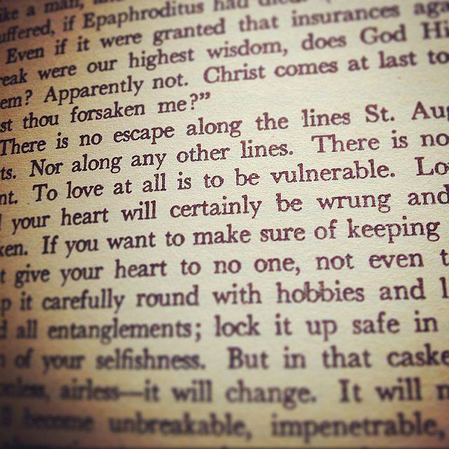 «Amar por completo es ser vulnerable. Ama cualquier cosa y tu corazón seguramente será estrujado y posiblemente, roto. Si quieres asegurarte de mantenerlo intacto, no debes darle tu corazón a nadie, ni siquiera a un animal. Cúbrelo cuidadosamente con pasatiempos y pequeños lujos; evita cualquier enredo; guárdalo bajo llave en al ataúd de tu egoismo. Pero en ese féretro, seguro, oscuro, sin movimiento y sin aire, cambiará. No lo harán pedazos; se volverá irrompible, impenetrable, irredimible. El único lugar a parte del cielo, donde puedes estar perfectamente seguro contra todos los peligros del amor, es el infierno».