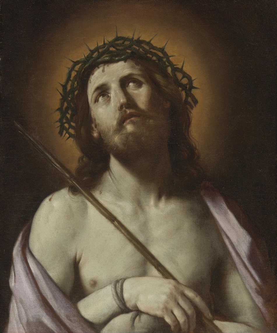 Pilato salió de nuevo fuera y les dijo: He aquí que os lo saco fuera para que sepáis que no encuentro en él culpa alguna. Jesús, pues, salió fuera llevando la corona de espinas y el manto de púrpura. Y Pilato les dijo: «Ecce homo»: He aquí al hombre¹⁵.