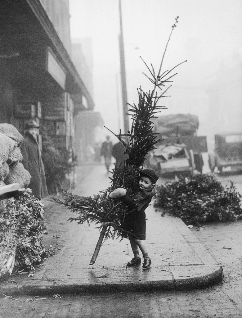Foto: An early arrival at Spitalfields Market, London, puts a youthful shoulder to the task of carrying a Christmas tree home, 14th December 1946. (Photo by Monty Fresco/Hulton Archive/Getty Images)