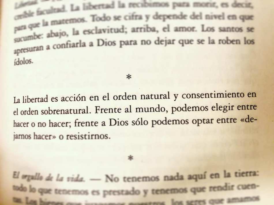 La libertad es acción en el orden natural y consentimiento en el orden sobrenatural. Frente al mundo, podemos elegir entre hacer o no hacer; frente a Dios sólo podemos optar entre «dejarnos hacer» o resistirnos.