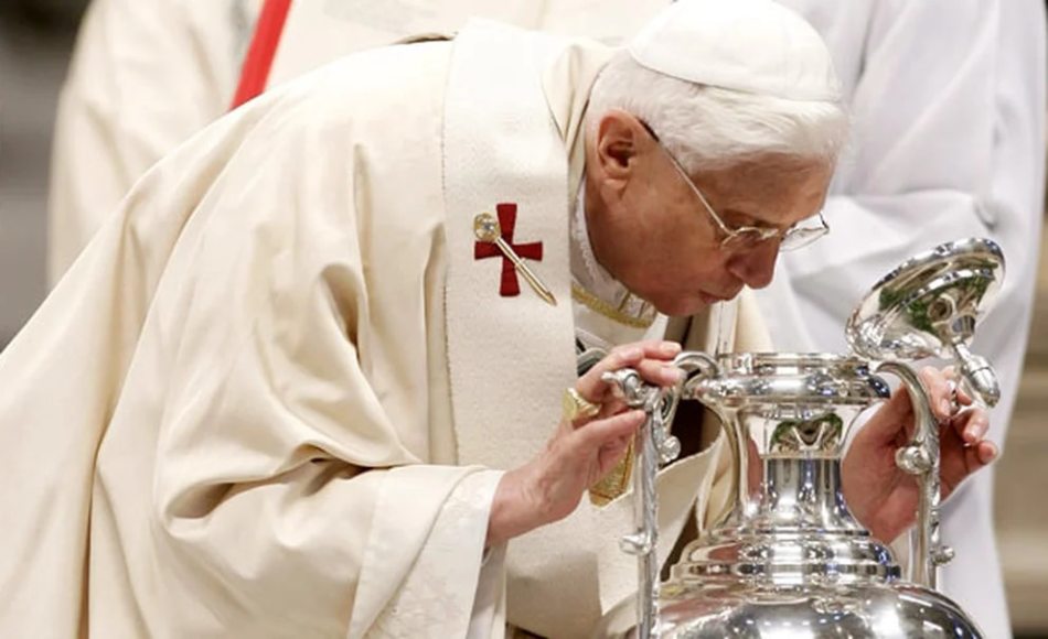 «Servirte en tu presencia»: Jesucristo, como el verdadero sumo Sacerdote del mundo, confirió a estas palabras una profundidad antes inimaginable. Él, que como Hijo era y es el Señor, quiso convertirse en el Siervo de Dios que la visión del libro del profeta Isaías había previsto. Quiso ser el servidor de todos. En el gesto del lavatorio de los pies quiso representar el conjunto de su sumo sacerdocio. Con el gesto del amor hasta el extremo, lava nuestros pies sucios; con la humildad de su servir nos purifica de la enfermedad de nuestra soberbia. Así nos permite convertirnos en comensales de Dios. Él se abajó, y la verdadera elevación del hombre se realiza ahora en nuestro subir con él y hacia él. Su elevación es la cruz. Es el abajamiento más profundo y, como amor llevado hasta el extremo, es a la vez el culmen de la elevación, la verdadera «elevación» del hombre.