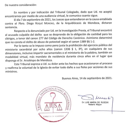 Preferiría no tener que dar estas noticias a nadie, ya que he sufrido mucho al enterarme de esto. Me dolió y me sigue doliendo mucho, pero si algo aprendí en unas charlas que escuché hace tiempo del p. Amedeo Cencini sobre los abusos sexuales en la Iglesia es que nada va a cambiar si no somos capaces de reconocer nuestro propio mal como Iglesia. No estoy de acuerdo con la forma en que se ha manejado, incluso le reclamé al obispo por no dar a conocer esta noticia que yo sigo sin poder encontrar en la página del Arzobispado de Mendoza aunque según él se publicó (si alguien lo encuentra le pido que me lo haga llegar), pero como miembro de la Iglesia, como hija de la Iglesia, me veo en la obligación de dar a conocer este documento.