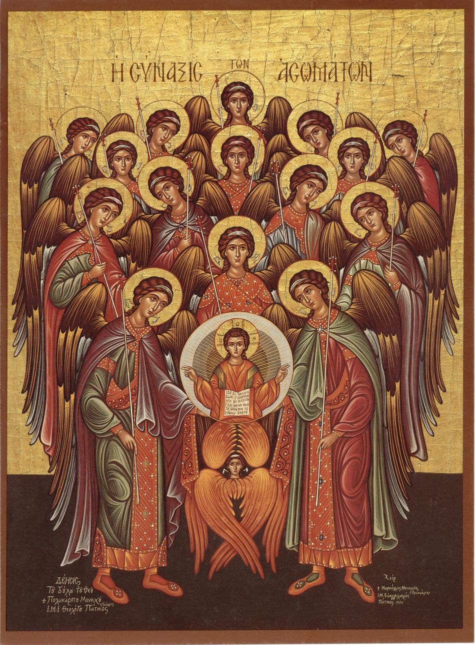 Según los Padres, los ángeles personifican las potencias celestes y han sido puestos por Dios junto a los pueblos como guías. Los ángeles toman una parte muy activa en la existencia histórica del mundo: llevan a cabo, bajo la guía del arcángel Miguel, una batalla contra los demonios, potencias de la nada y remedos de los ángeles, y salvaguardan el orden cósmico. Según san Basilio, los ángeles del Juicio «pesan» las almas. Ellos, que asisten a toda acción divina, están presentes de un modo particular en el martirio. La escala de Jacob los muestra como mensajeros de Dios. Están como «adheridos» a la Palabra y a la voluntad de Dios y las personifican. Cuando Dios decide curar, su voluntad toma la figura del ángel Rafael.