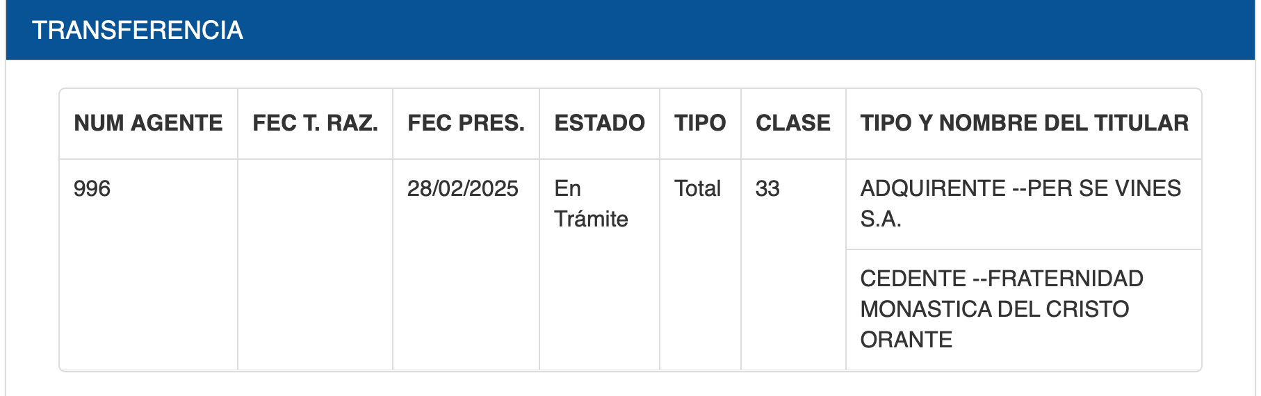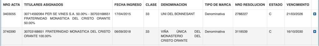Como consta en el INPI, la marca “Viña única del Monasterio del Cristo Orante” pertenece en un 100% a la Fraternidad Monástica del Cristo Orante desde el 16/10/2020 por 10 años. Pero casualmente el pasado 28 de febrero de 2025 iniciaron el trámite para vender la marca a la empresa Persé Vines. Esto demuestra que no desconocen en absoluto el tema y que a lo mejor quieren desligarse de la marca para también desligarse de las responsabilidades de usufructuar con el nombre de un monasterio cerrado definitivamente por la Iglesia desde diciembre de 2018. Pero desde entonces y hasta la fecha continúan lucrando con ese nombre, como si nunca hubiera pasado nada allí.