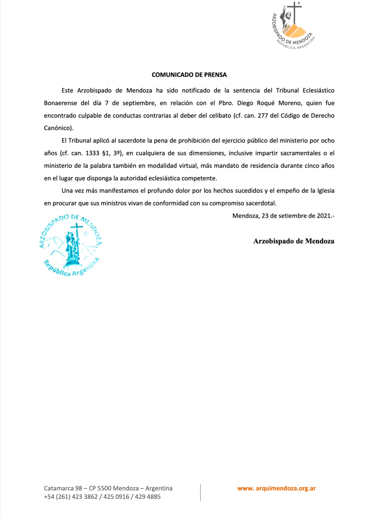 El Arzobispado de Mendoza envió hoy el Comunicado de Prensa donde se dio a conocer la sentencia en contra del Pbro. Diego Roqué Moreno (Diego de Jesús), manifestando «el profundo dolor por los hechos sucedidos y el empeño de la Iglesia en procurar que sus ministros vivan de conformidad con su compromiso sacerdotal».